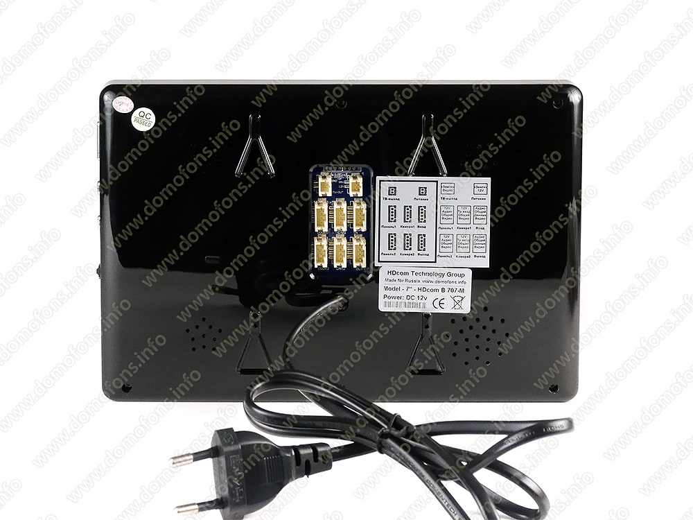 Проводной видеодомофон «HDcom B-707» это комплект видеомонитора и вызывной панели. Диагональ экрана монитора составляет 7 дюймов, оснащен сенсорными кнопками управления. Вызывная панель выполнена из металла, может устанавливаться на улице, оснащена встроенной видеокамерой с разрешением 800 ТВЛ. Систему можно расширить до четырех мониторов, двух видеопанелей, двух видеокамер и двух датчиков сигнализации. Один из видеоканалов можно настроить на детекцию движения с автоматической записью.